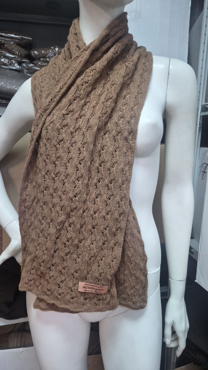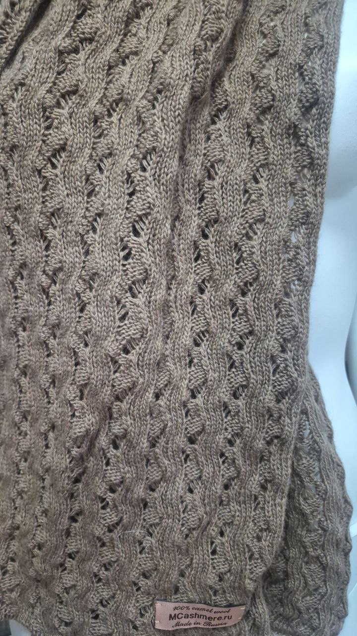 Ажурный шарфик из шелковистого монгольского 100%-ного верблюжьего пуха. С таким шарфиком Вы не замёрзнете в любой мороз. Подойдет и как модный аксессуар, при этом, в отличии от шарфов из смесей акрила с овечьей шерстью, наш шарф не будет давить весом на плечи и грудь. Он – легок, приятен в прикосновении, его приятно брать в руки!